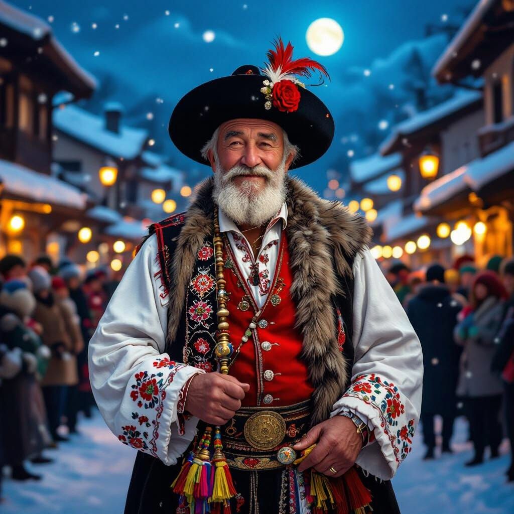 This image shows an elderly man in traditional Bulgarian Koledar festive attire, including a richly embroidered shirt and fur-lined coat. The style evokes a whimsical, deeply colored animated aesthetic.