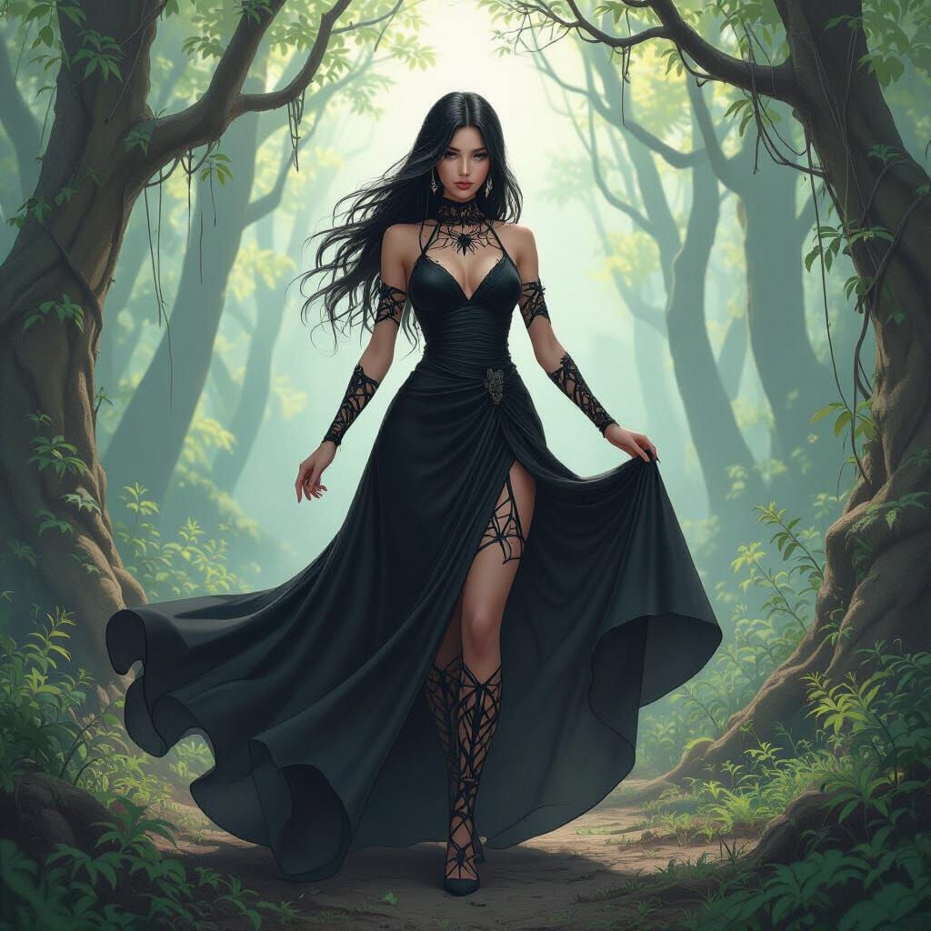 A captivating image of a spider-human hybrid in a black dress, set in a mystical forest. The artwork blends realistic textures with fantasy elements, in a style reminiscent of contemporary digital art.