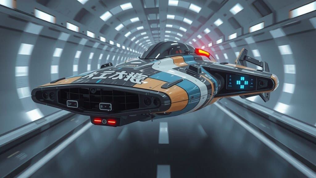 photo photorealistic photographic realism aerial 3D angled photo of a far future flying floating soaring cyber tech sport hover-speeder with huge sporty future logos with chunky Japanese lettering with rounded edges. aerodynamicly designed plastic multicolour and black colour block sections with forward ...