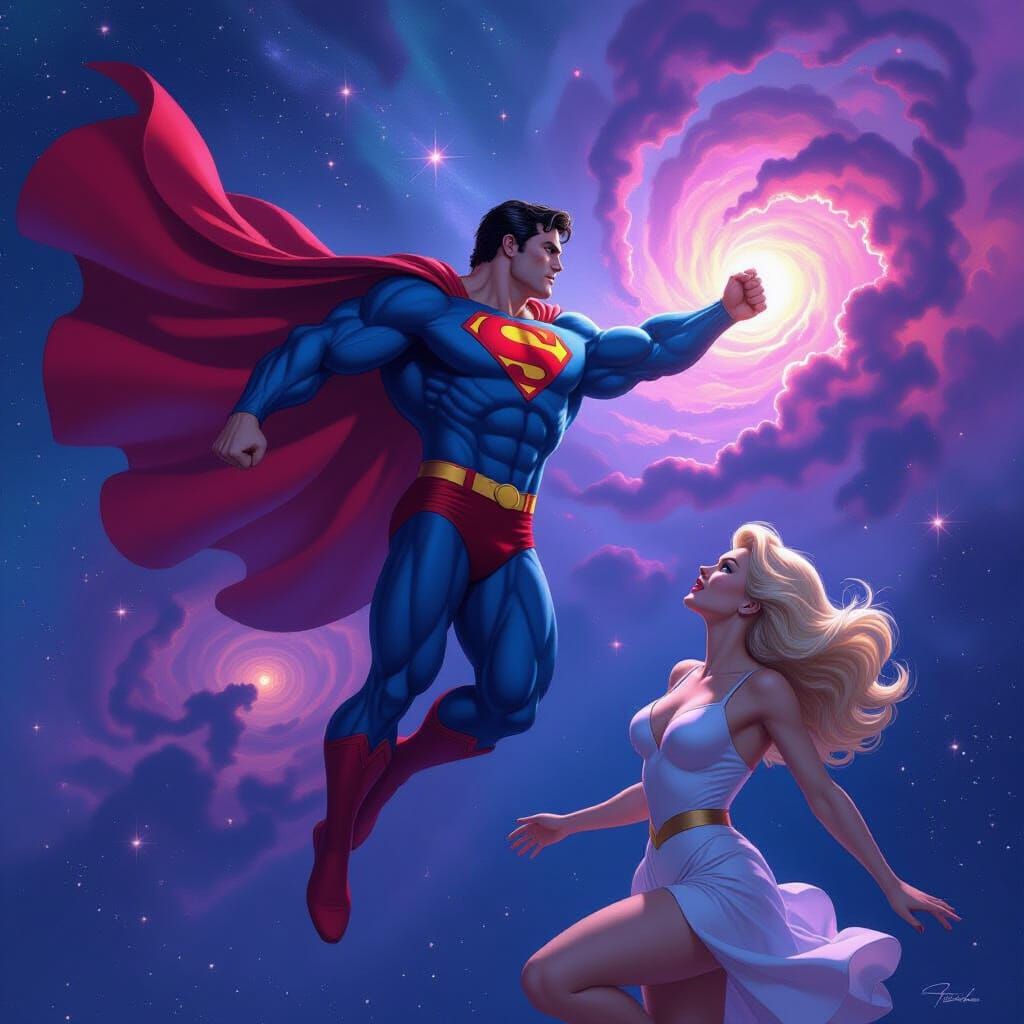 This image depicts a vintage Hercules Superman meeting a blonde woman amidst swirling nebulae in deep space, rendered with a painted, heroic quality and realistic anatomy.