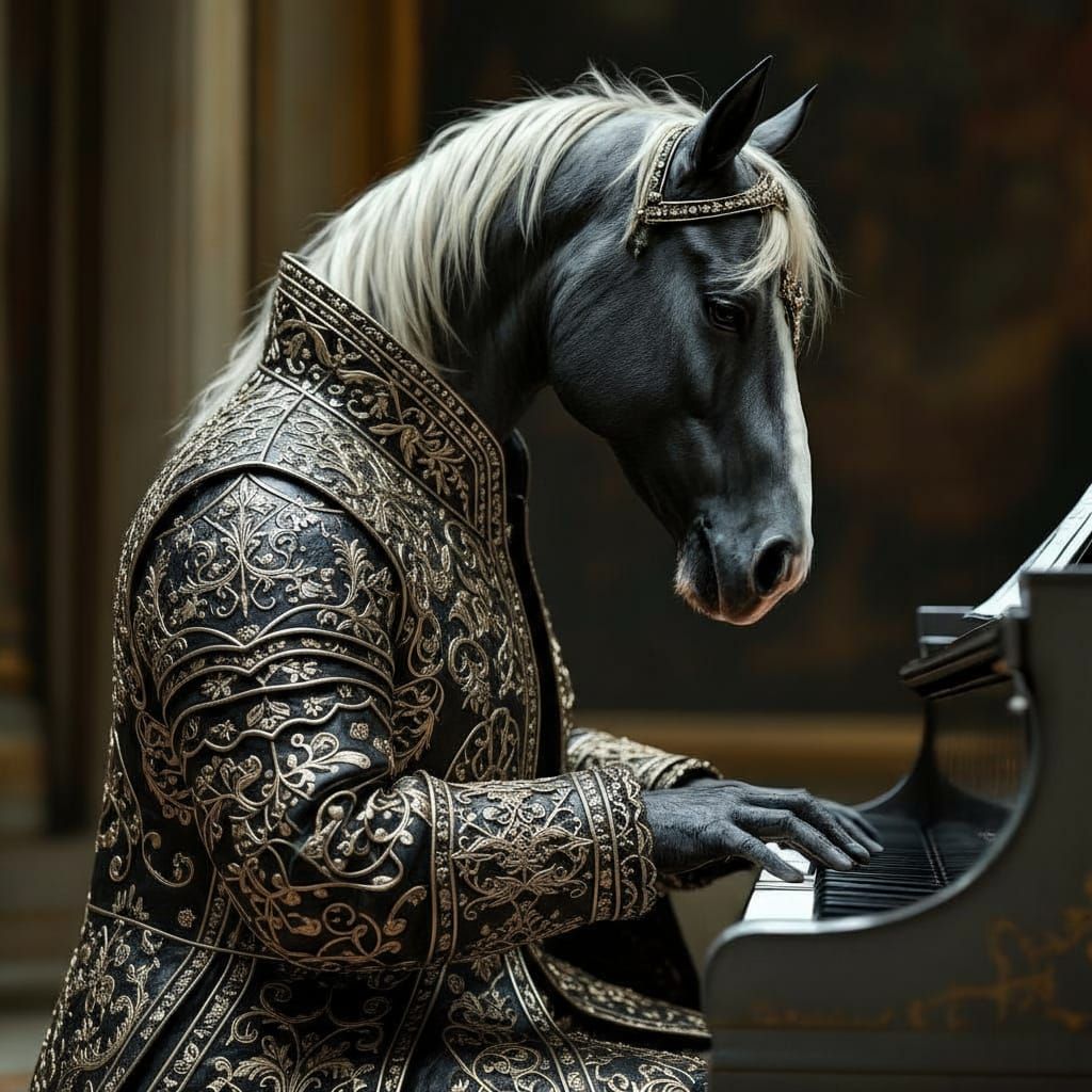 This image shows a horse playing a piano while wearing a highly detailed and ornate robe that resembles ceremonial armor. The style evokes baroque sensibilities with ultra-HD textures and dramatic lighting.
