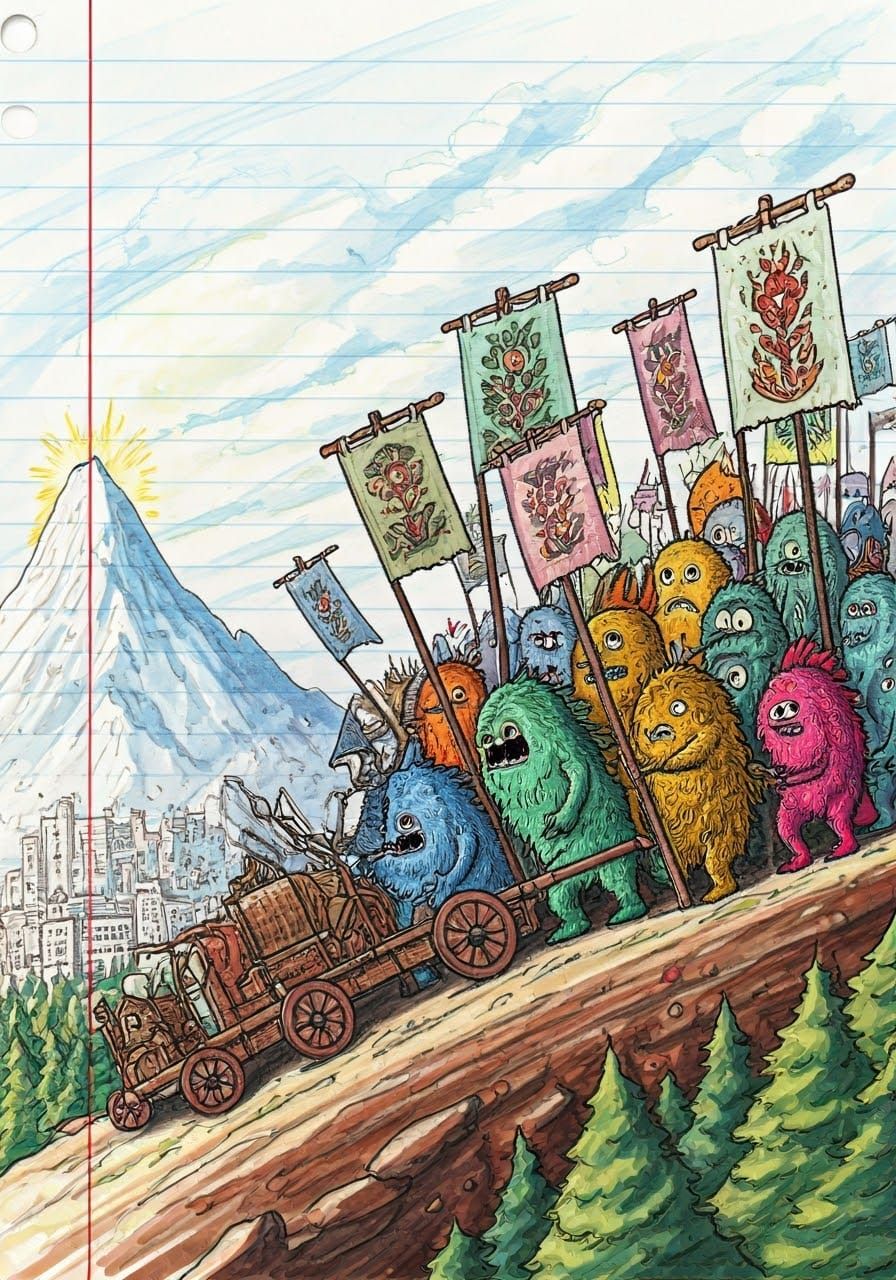 This image shows a vibrant, hand-drawn doodle of monster stick figures marching to war. The chaotic scene includes weapons, banners, wagons, and a cityscape backdrop, all rendered in a scribbled, impressionistic style.