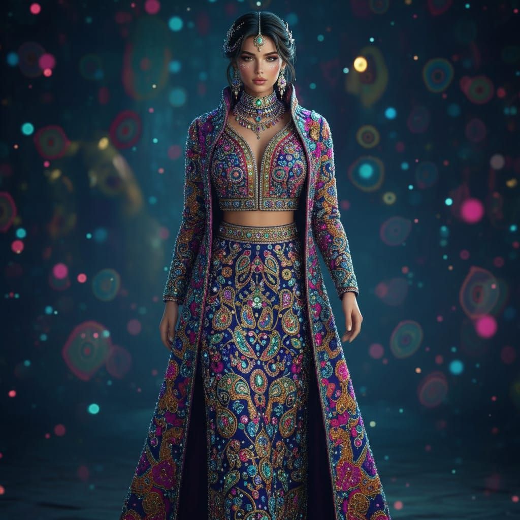 This image showcases a hyperrealistic portrait of a woman adorned in vibrant, detailed rhinestone clothing and avant-garde jewelry. Presented in a fantasy concept art style with deep, complementary colors.