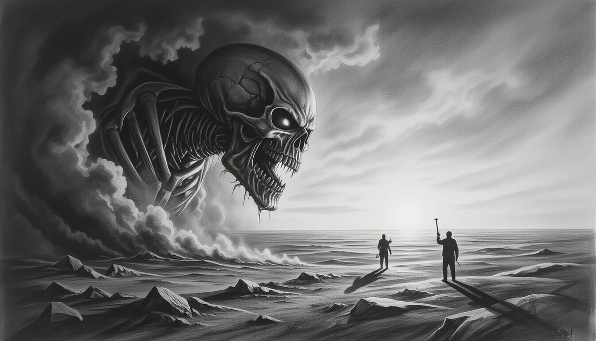This image shows a hyperdetailed charcoal drawing of vast horizons approaching like a relentless, destructive force. The artwork captures a dramatic and intense mood.