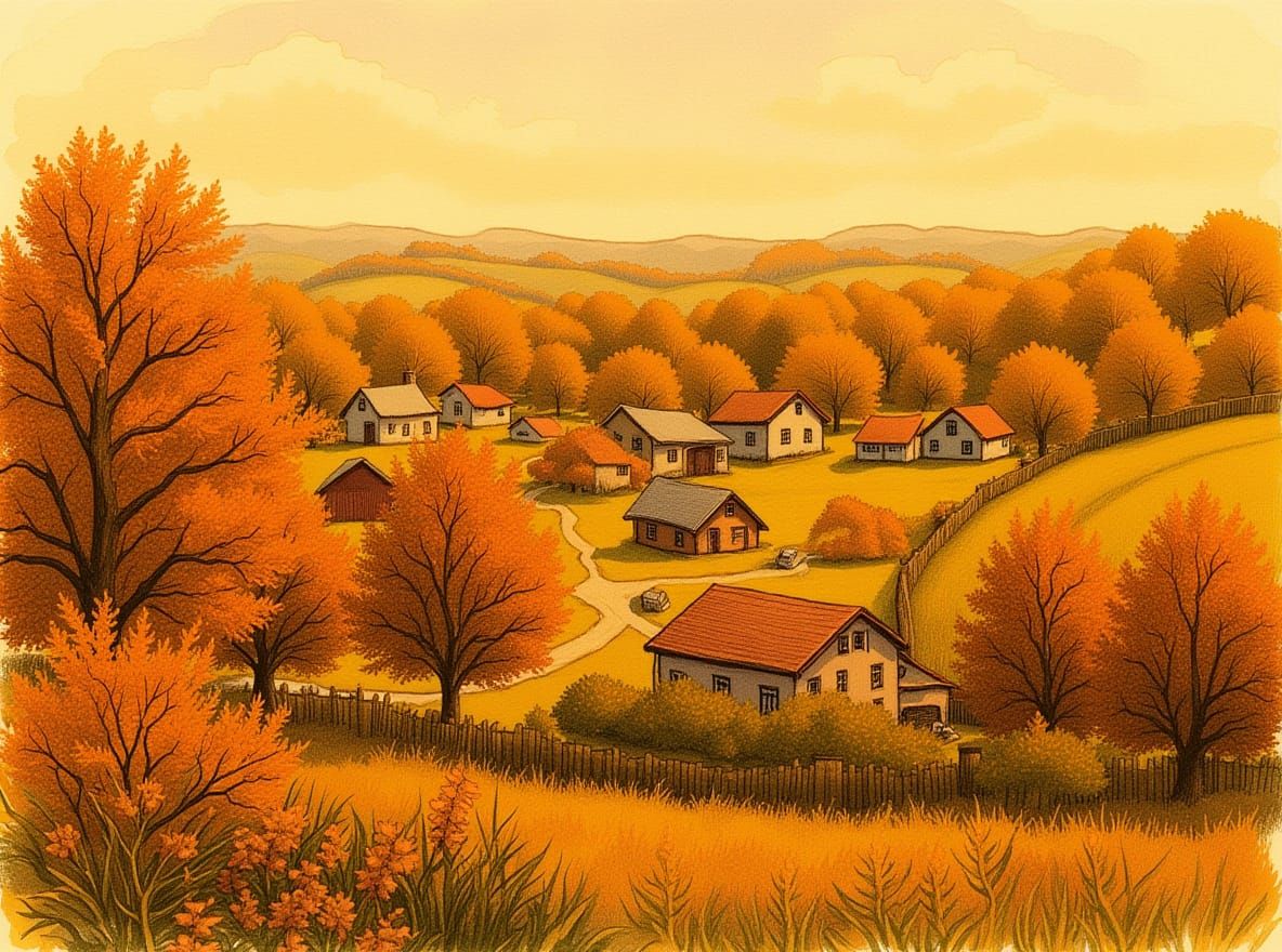 A picturesque village surrounded by autumnal trees and foliage. Golden light bathes the scene, rendered with alcohol ink and watercolor textures in a whimsical, painterly style.