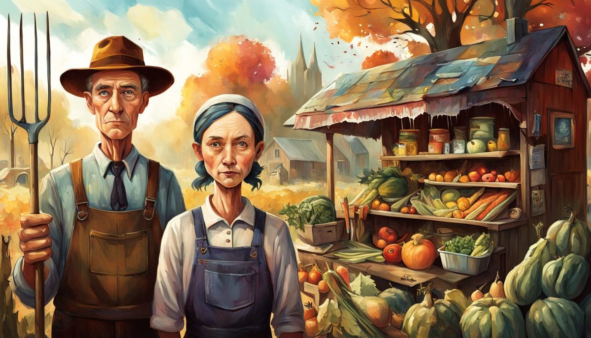 A farmer and his wife stand before a bountiful roadside stand, inspired by American Gothic. The scene captures a crisp autumn morning with vibrant produce, rendered in a nostalgic, painterly style.