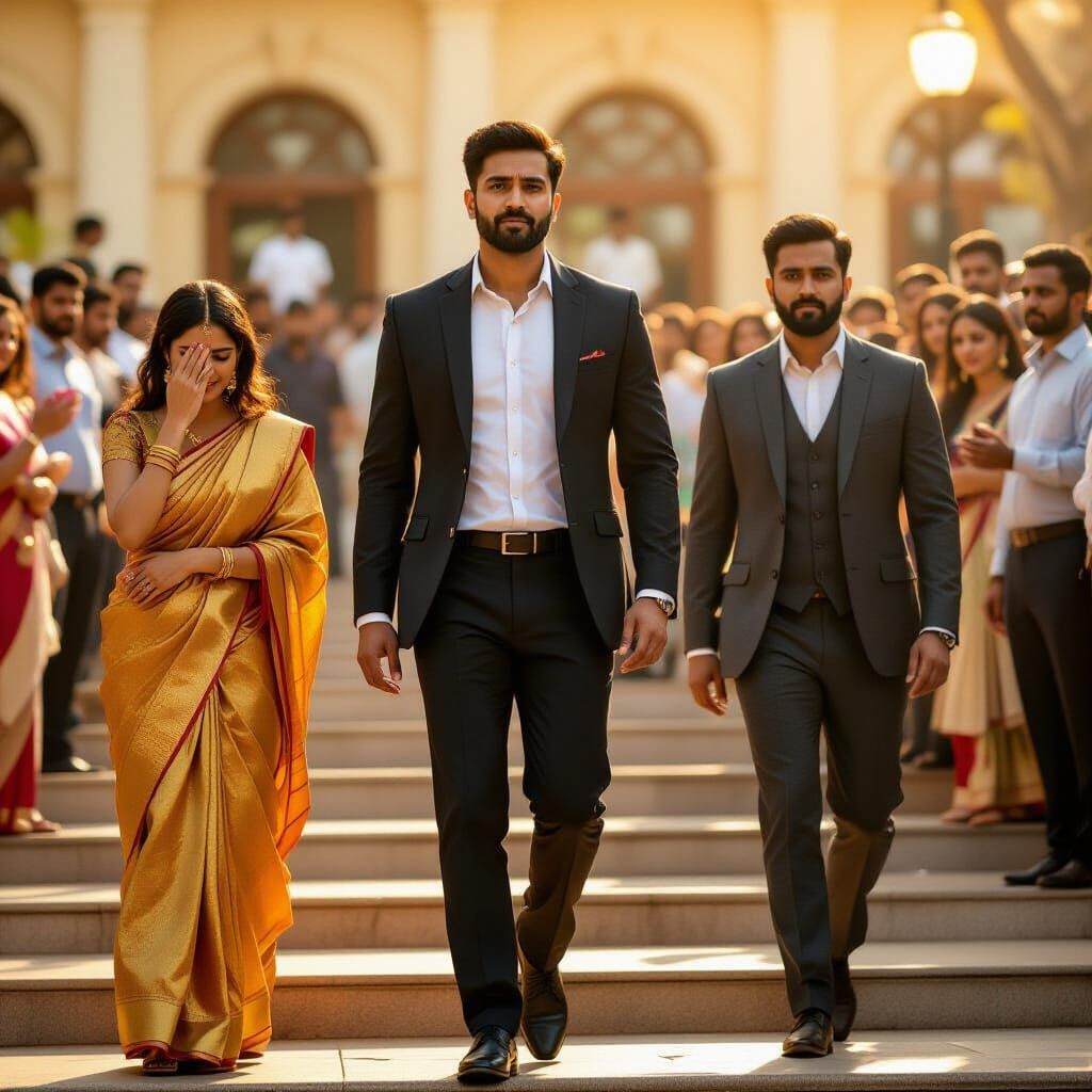 A man in a blazer walks down courthouse stairs into warm sunlight, his face showing emotion. A woman in a saree and another man in a suit are nearby, with a crowd in the background. Rendered in a photorealistic 3D style with atmospheric detail.