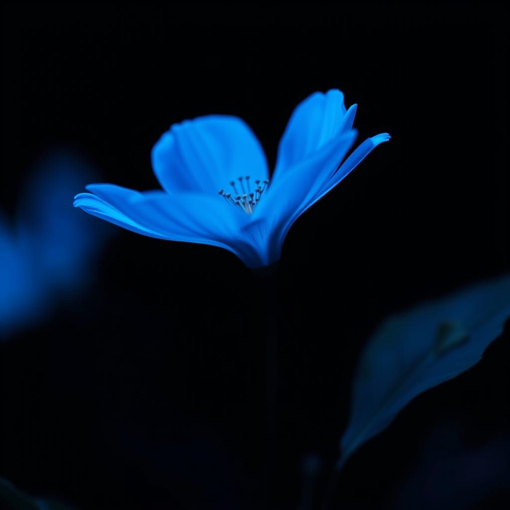 A striking picture of a vibrant blue flower blooming in darkness. The rich blue petals are illuminated against a black background, creating a futuristic and atmospheric image with neon highlights.