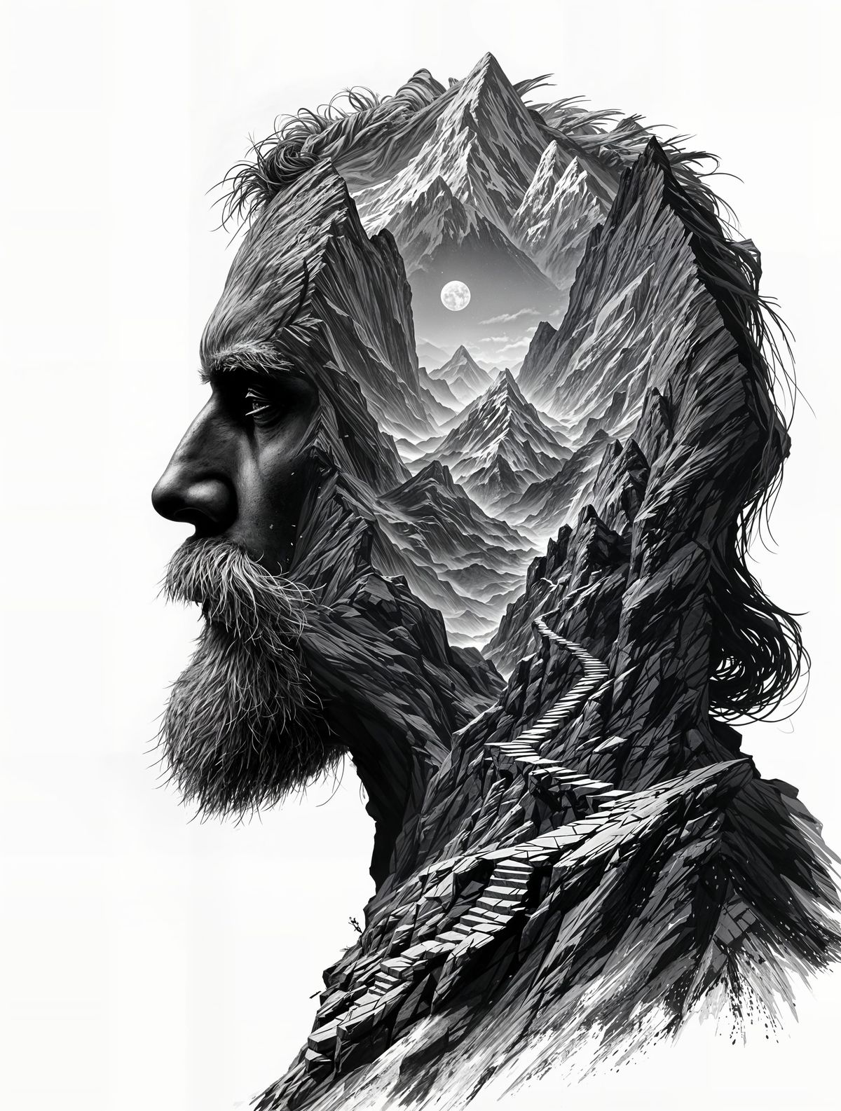 This image features a surreal, hyperrealistic black and white artwork depicting the silhouette of an ancient man's head containing a miniature mountain landscape with intricate detail and high contrast.