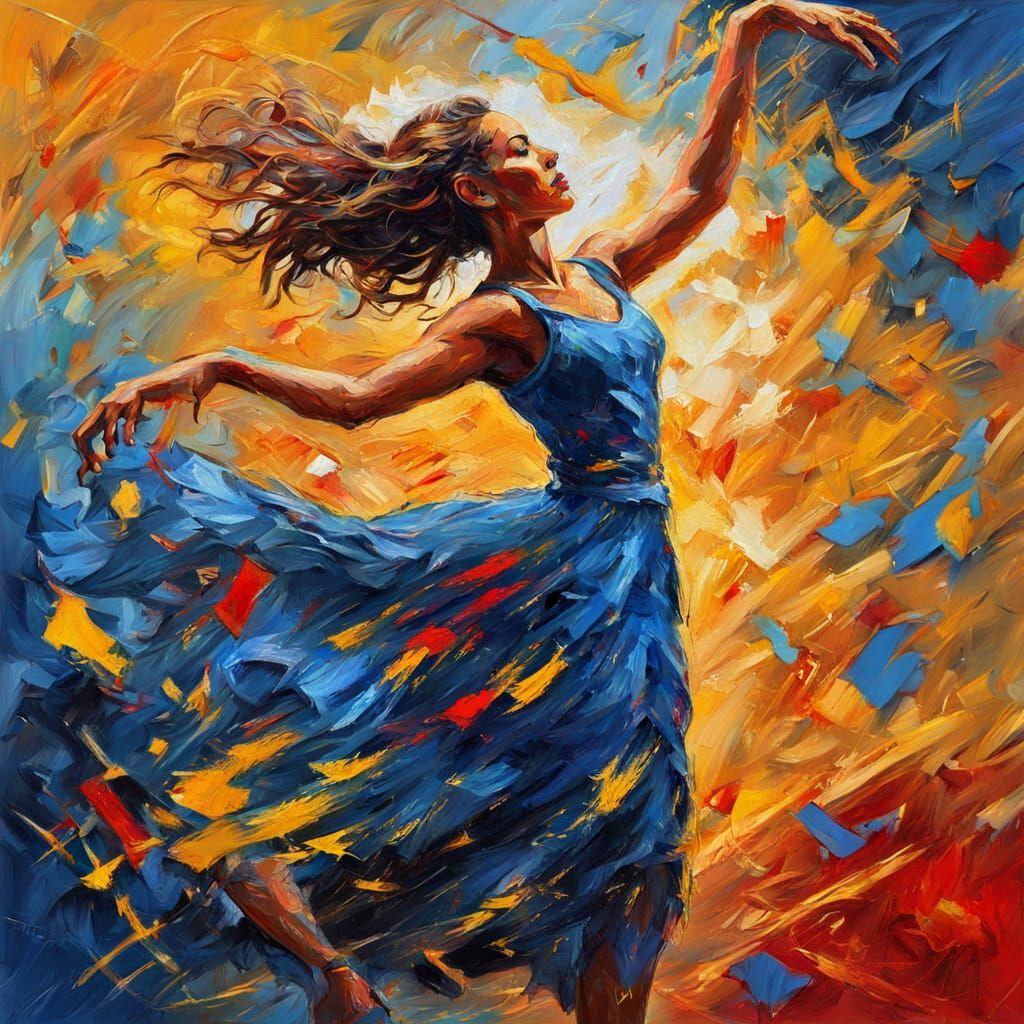 A vibrant image of a woman dancing. This close-up, medium shot captures the energy of the dance through the style of expressionism as an impasto oil painting.