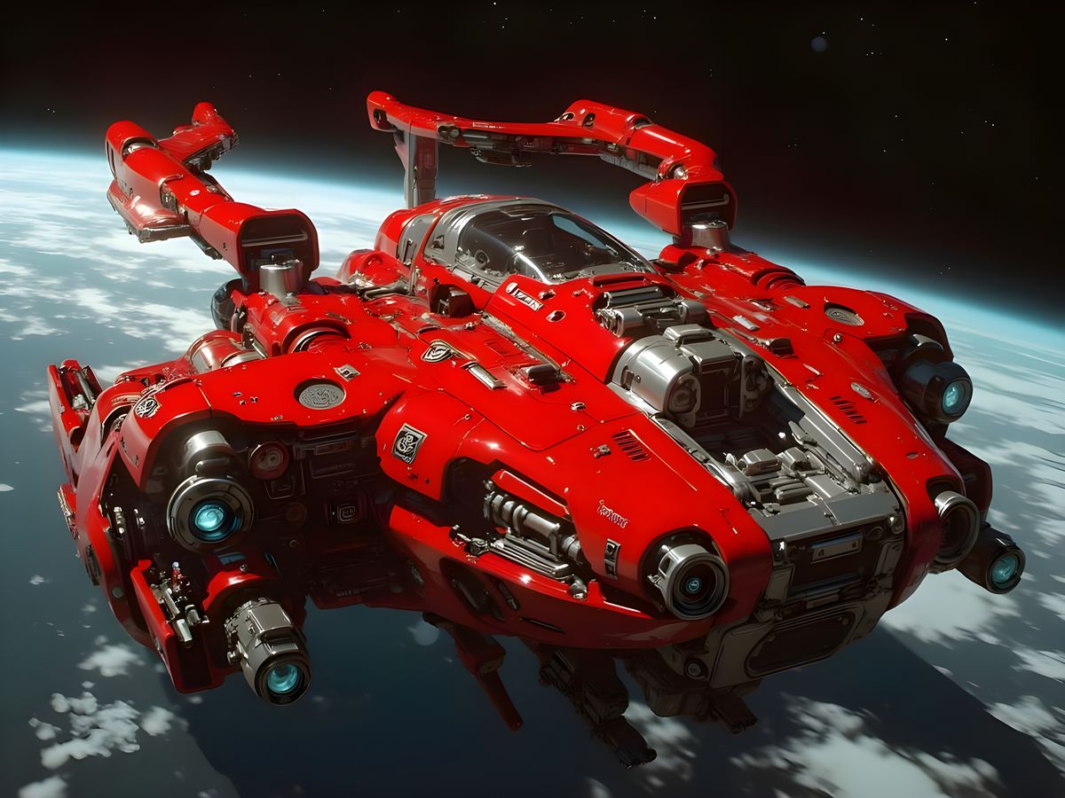 This image shows a futuristic spaceship designed as a heavy gunship. The spacecraft features metallic red coloring and silver detailing, rendered in high definition to create a realistic science fiction scene.