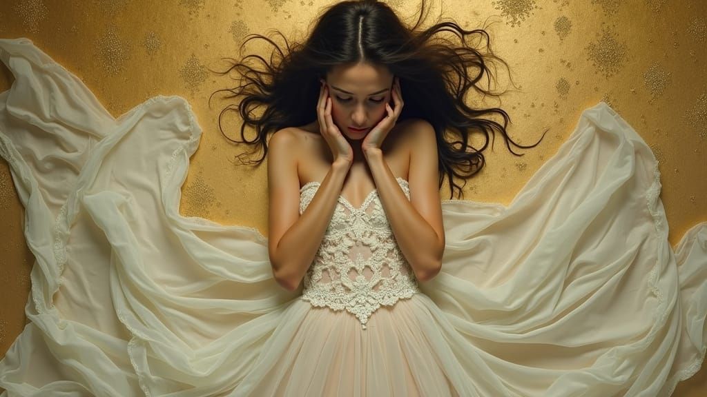 This image shows a young woman on the verge of a mental breakdown, her emotional distress palpable in a beautiful, flowing white dress with intricate lace details, evoking a sense of vulnerability and turmoil in a unique artistic blend of Symbolism and Expressionism.