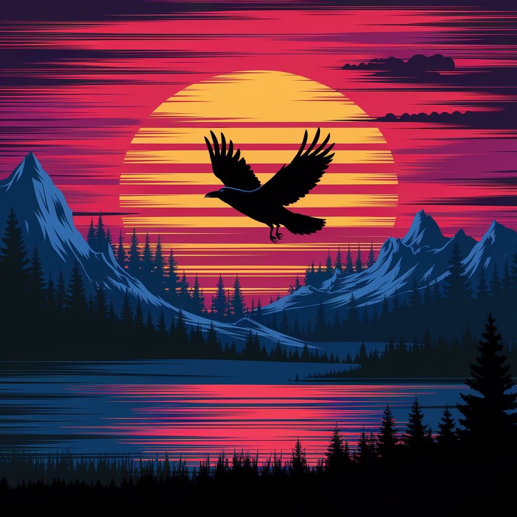 This image captures a raven in flight across a breathtaking sunset landscape, with every element rendered in striking, tiny stripes of color, evoking a sense of cinematic atmosphere and moody beauty.