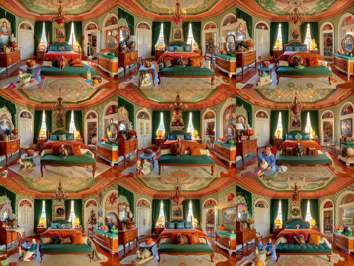This image shows a Thanksgiving-themed master bedroom scene with grandma and grandpa turkey figures. The maximalist decor suggests a time capsule aesthetic, evoking a vintage and nostalgic atmosphere.