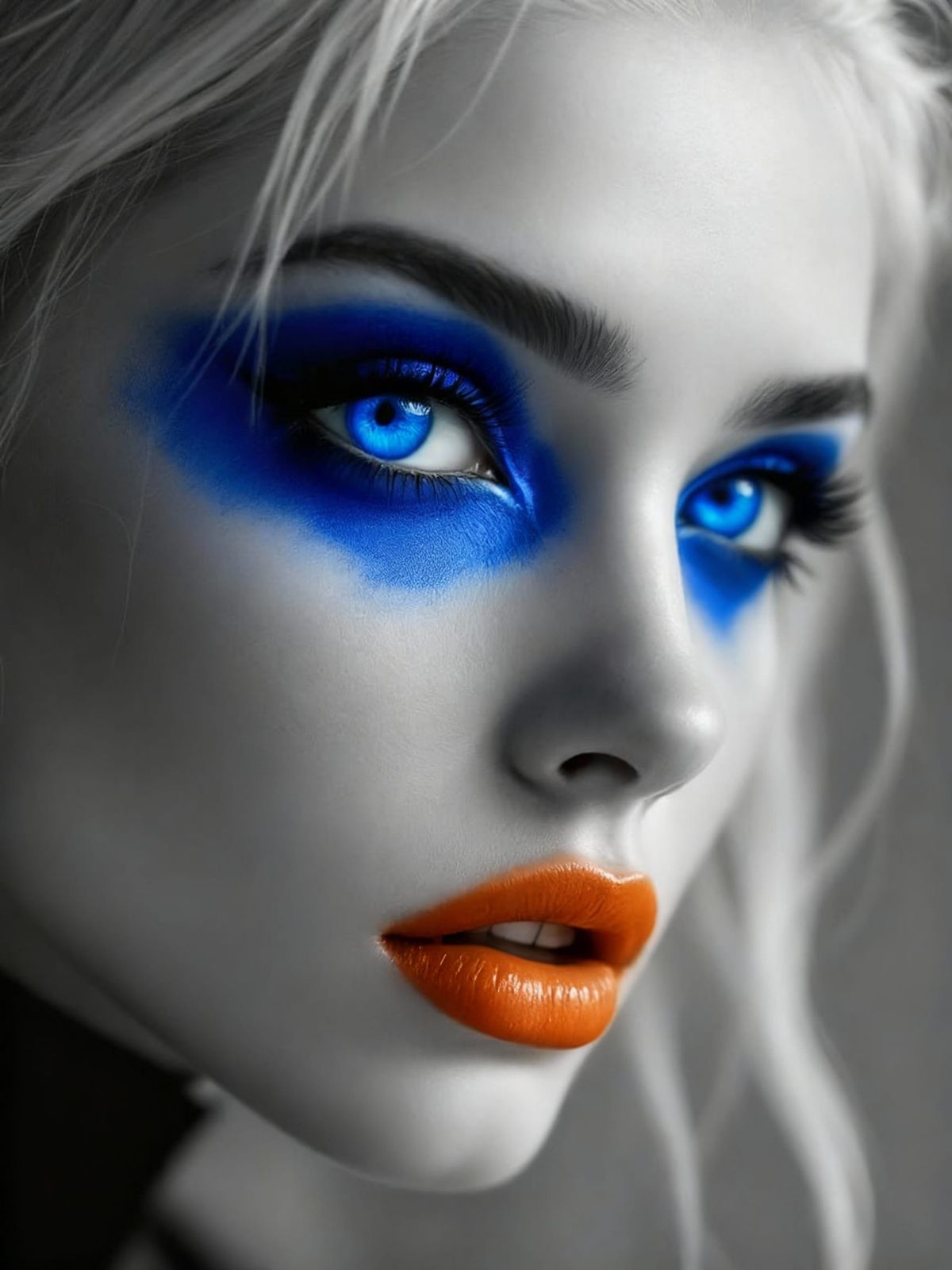 A striking monochrome portrait of a woman with white hair. Her intense blue eyes and vivid orange lips provide a bold contrast against the grayscale tones, presented with a polished digital finish.