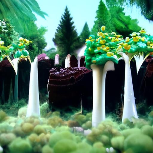 This image shows a surreal forest made of cake. The digital matte painting creates a dramatic and atmospheric scene, rendered with intricate detail and a maximalist aesthetic.