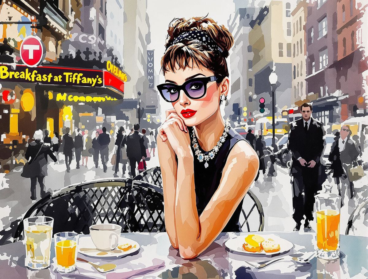 A scene from the iconic 1961 film 'Breakfast at Tiffany's' starring the legendary actress Audrey Hepburn, featuring a captivating and elegant visual representation of the main character Holly Golightly, with a focus on her signature style and the film's themes of love, identity, and self-discovery, set ...