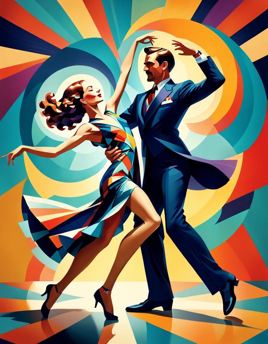 This image shows a man and woman dancing in formal wear. The background features art deco geometric shapes, rendered in a bold, vibrant, cubist style. It captures an energetic, celebratory mood.