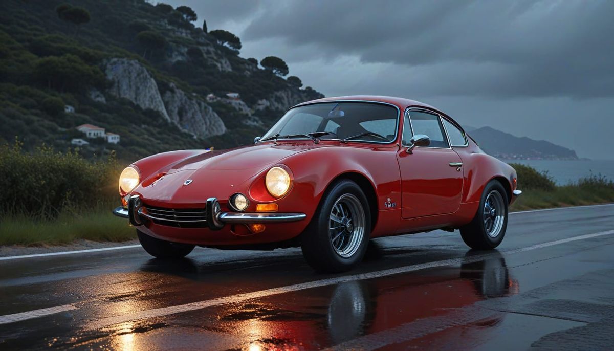 This image shows a vintage 1972 Alpine A110 speeding along a winding coastal road at dusk. The car's glossy finish contrasts with the rugged coastline in an expressionist style.