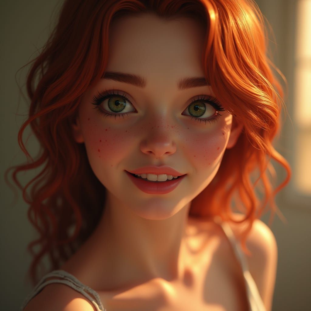 This AI-generated image features a European woman with milky skin, red hair, and green eyes. Cinematic lighting highlights her thoughtful expression and detailed skin texture.