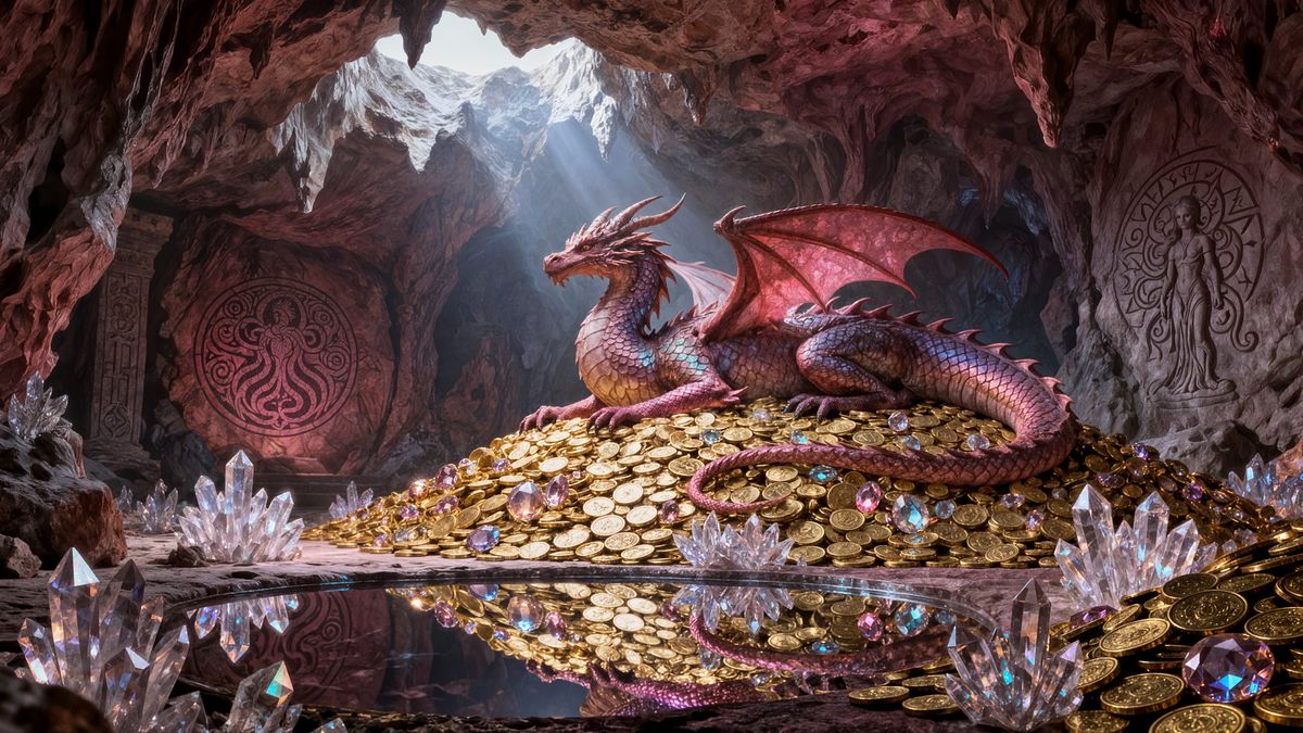 A striking image of a majestic crimson dragon resting on a treasure hoard in an ancient cavern. Ethereal light illuminates the scene, highlighting intricate details and arcane carvings on the walls, creating an enchanting yet unsettling atmosphere.