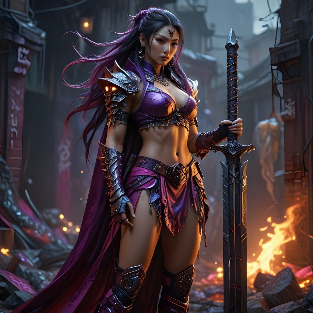 3 asian female demon hunters dressed in a graffiti painted cyberpunk type clothing , extremely long flowing hair in intricate braids, very long and purple with pink hue,clothing is colourful and vivid graffiti paint, one in purple and pink, one in red and black , one in blue and white all have different ...