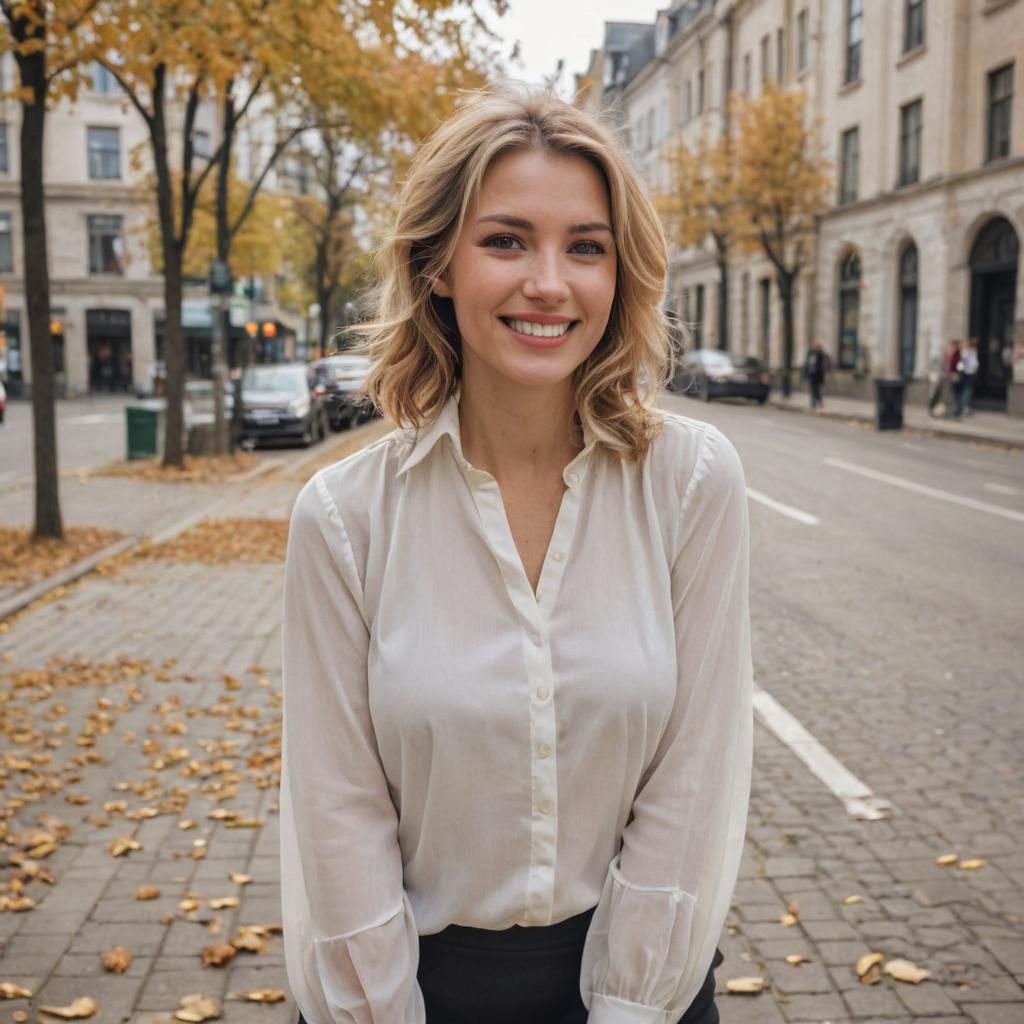 This image depicts a smiling, attractive woman with blonde hair in a black miniskirt and white blouse. She is standing in a city during autumn.