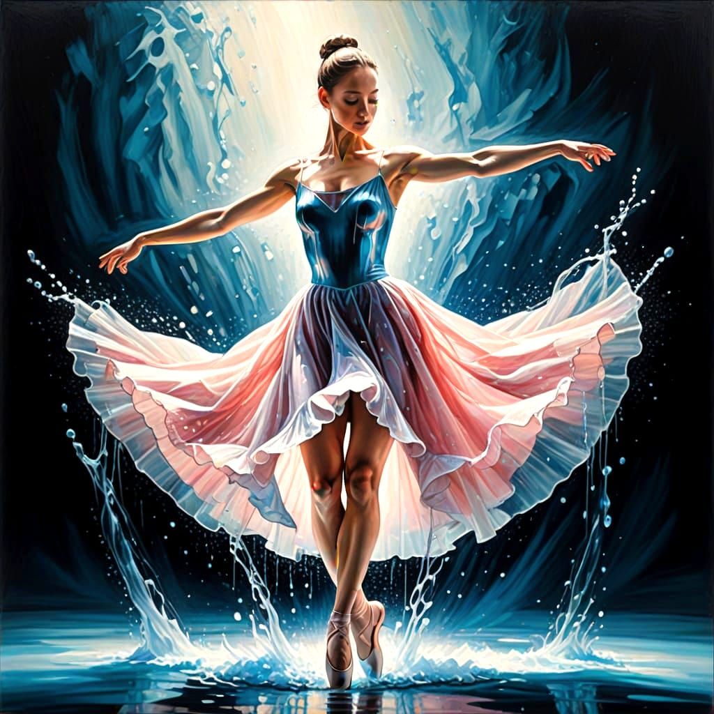 This image shows a ballerina striking a dramatic pose, her flowing dress made of shimmering water that seems to defy gravity, set against a stark and dynamic backdrop of light and shadow.