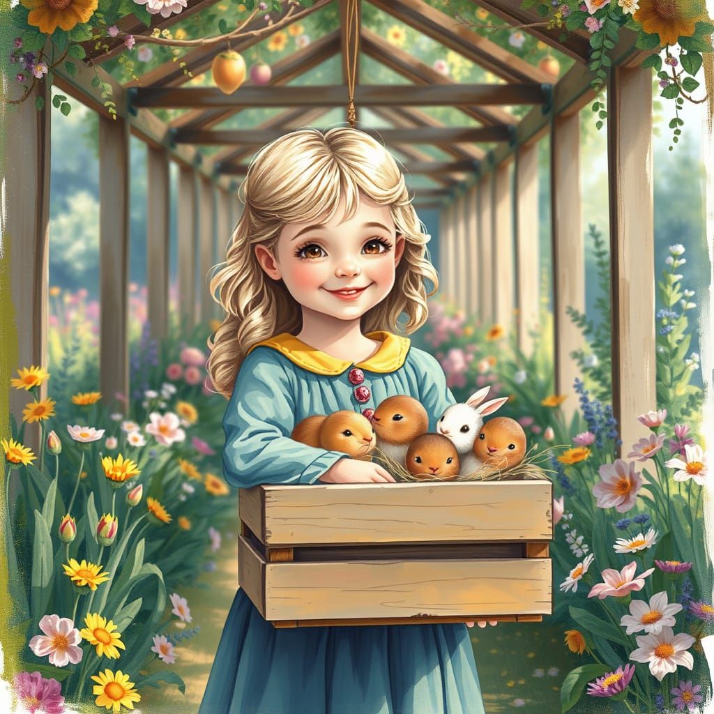 This image shows a young European girl with curly blonde hair and a bright smile, wearing a light rainbow-colored dress and pushing a wooden cart filled with colorful Easter eggs along a shaded garden path lined with spring flowers, in a soft and whimsical style reminiscent of Impressionist art