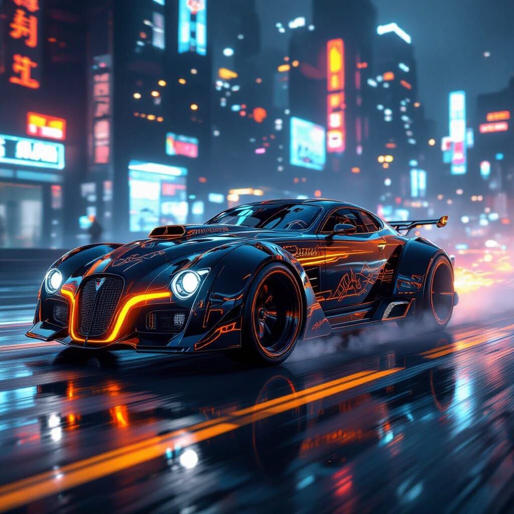 A futuristic black hot rod with orange accents races through a wet, neon-lit city at night. Orange and blue lights create reflections on the asphalt, with volumetric fog adding to the cinematic atmosphere.