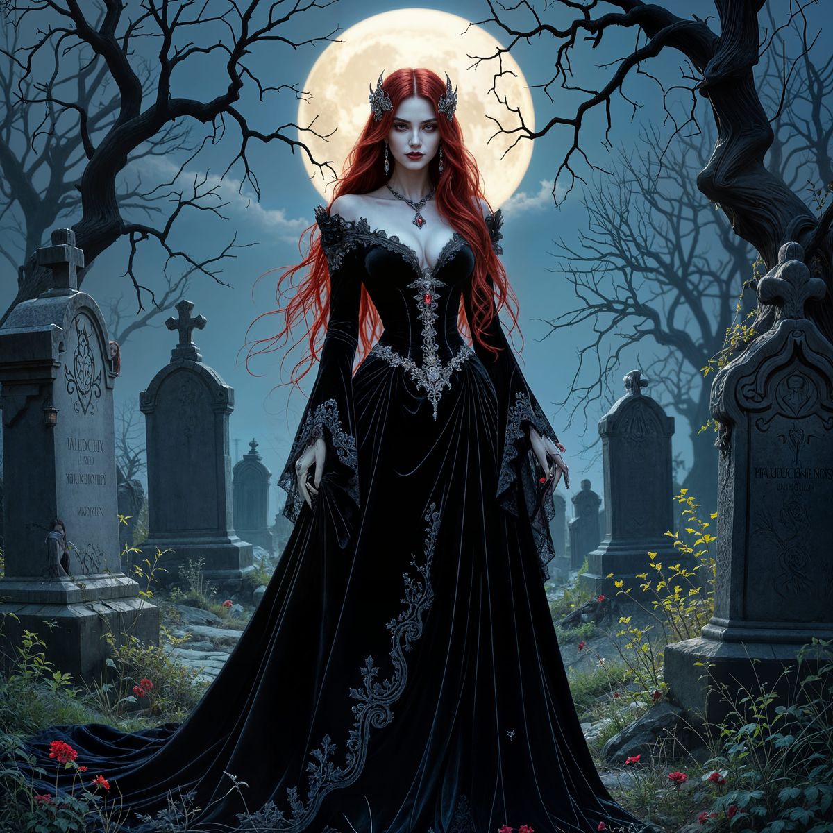 This image shows a vampire queen with crimson hair in a graveyard. She wears a black velvet gown with silver lace. The image blends gothic romanticism with hyperrealism and ornate detailing.