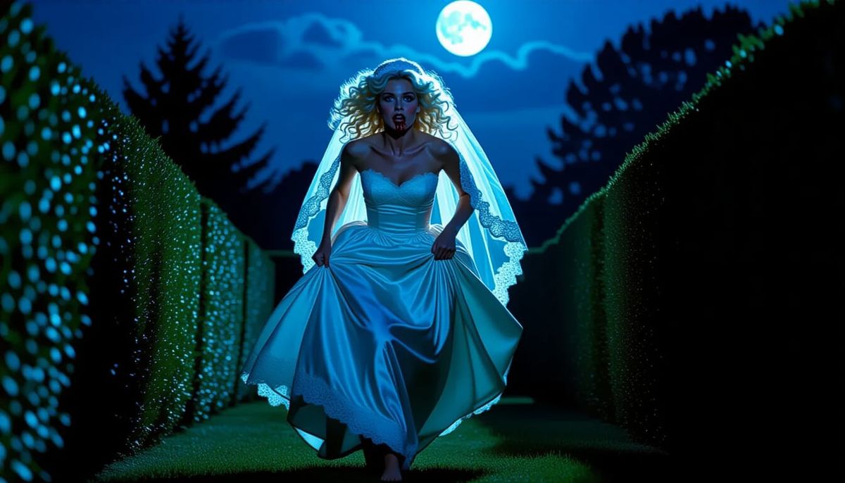 This image shows a terrified bride fleeing through a maze under a blue moon, styled as a still from a slasher film. The woman's satin gown and veil are bloodied as she looks back in fear.