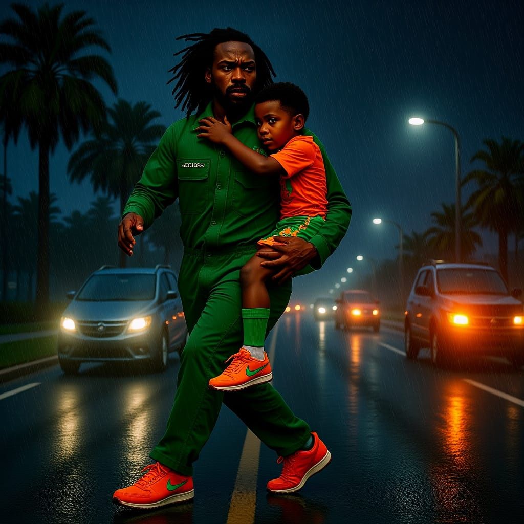 A striking image of a man in green coveralls carrying a boy in a football uniform, escaping danger on a wet highway during a rainstorm. Rendered in a dramatic, cinematic style with high contrast lighting.