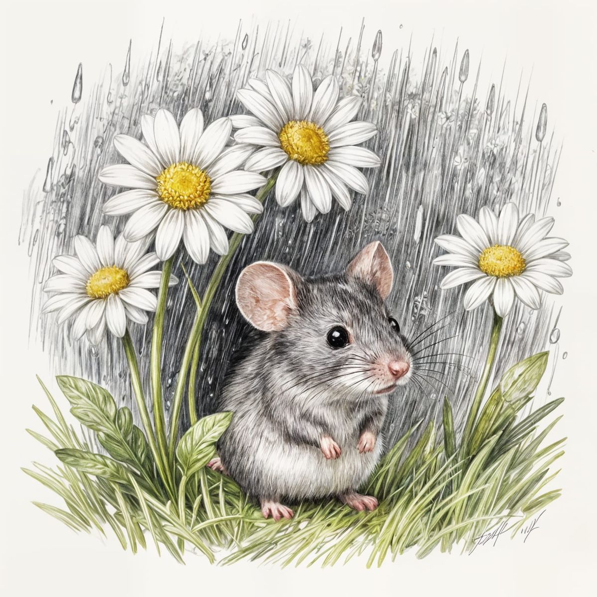 This image shows a delicate pencil drawing of a small mouse finding shelter beneath a daisy during a rain shower. The artwork captures a moment of quiet refuge in nature.