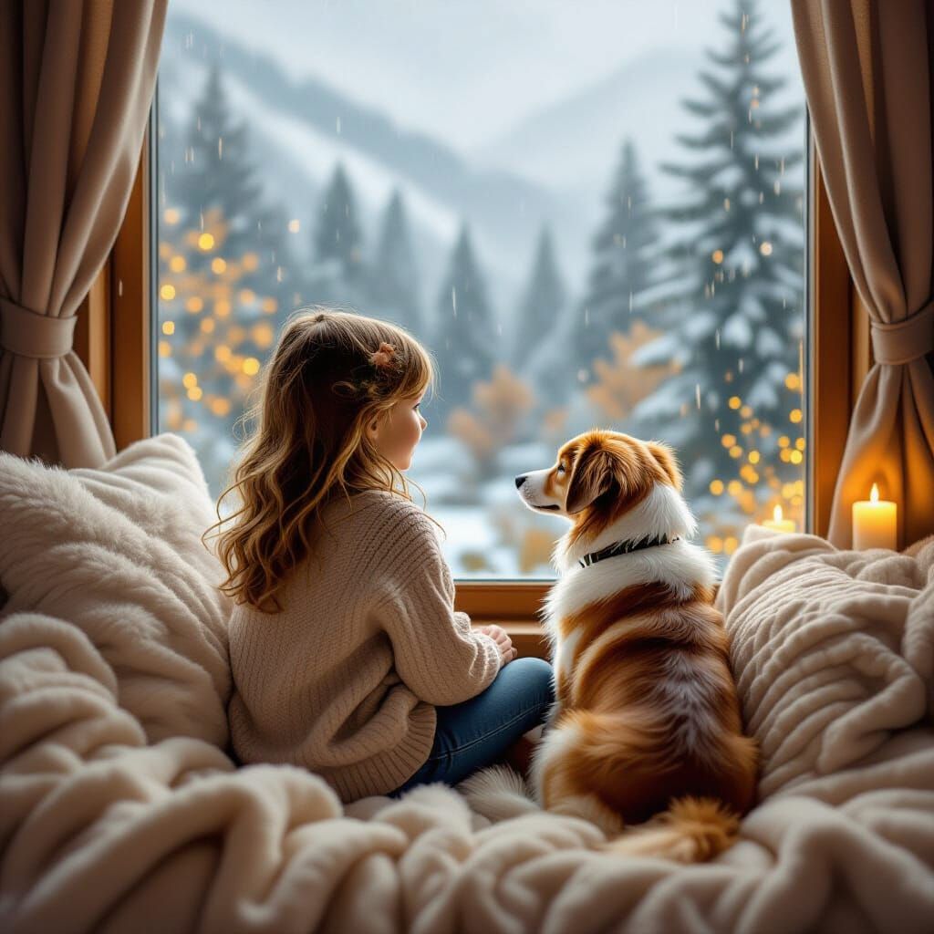 A heartwarming image of a girl and her dog watching the rain from inside a cozy cafe. The scene is bathed in warm light, decorated with earthy tones and soft textures, in an expressive impasto style.