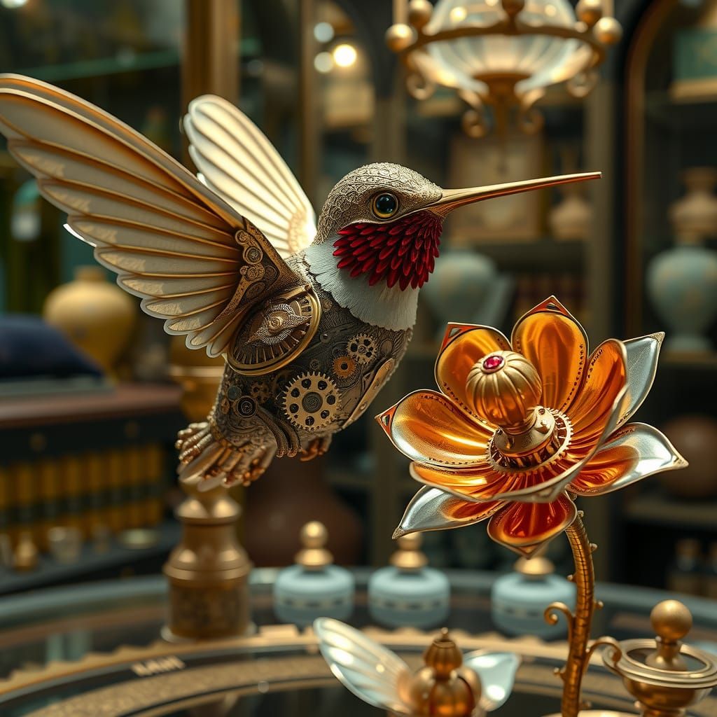 This image shows a steampunk hummingbird sculpture made from gears and mechanical parts with ruby eyes. It hovers by a clockwork flower in a jewelry shop, blending art and technology.