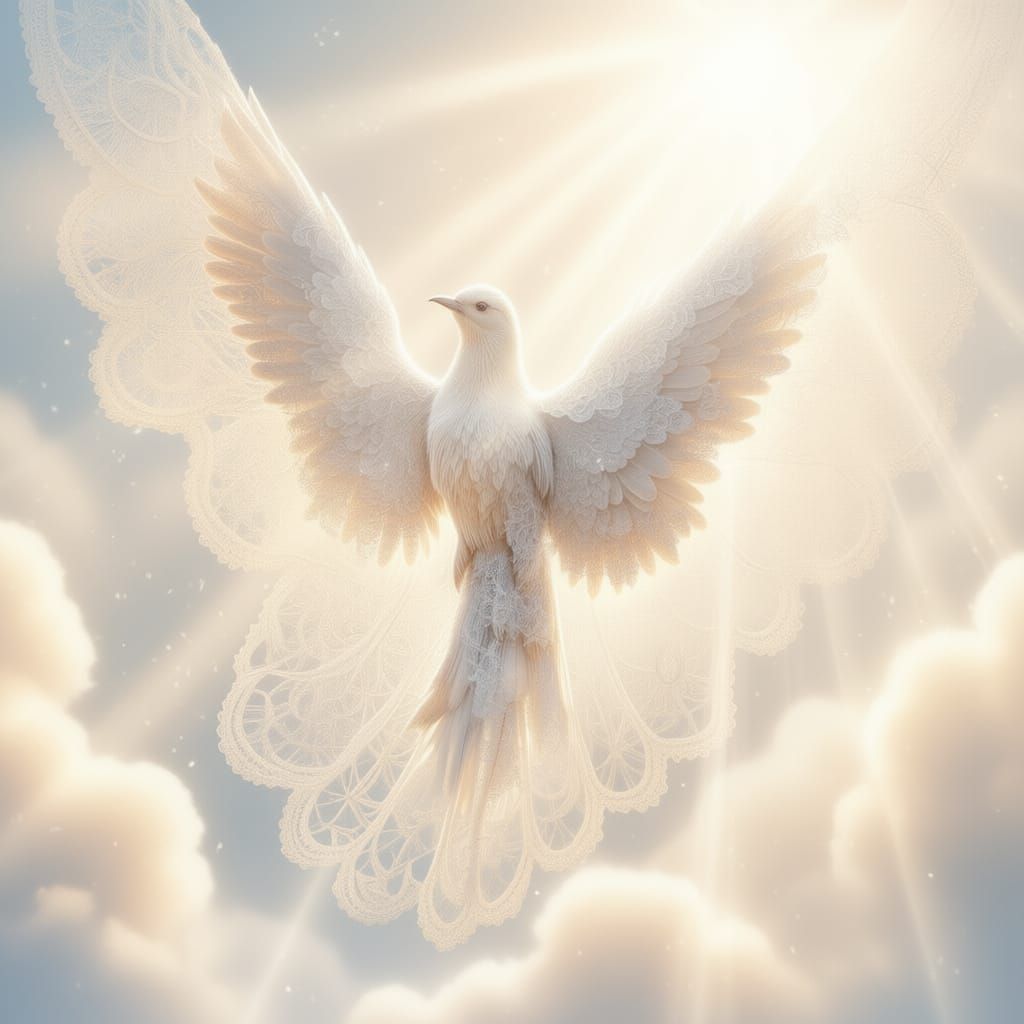 This image features stunning birds with delicate, intricate lace-like wings bathed in divine, soft-focus heavenly sunshine beams.