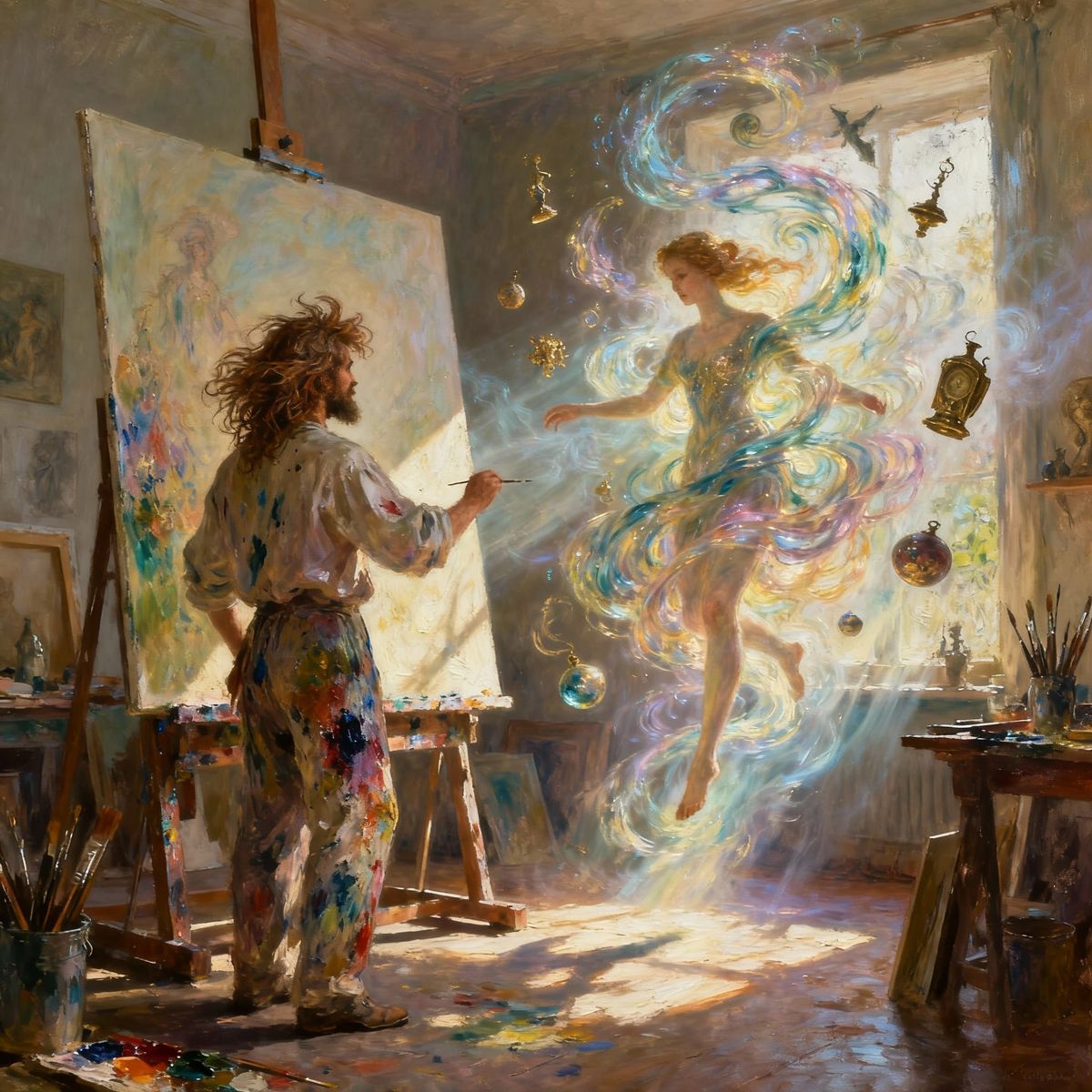 This hyperrealistic oil painting shows a magical artist whose creations leap from the canvas. Ethereal light and dynamic shadows illuminate the scene, showcasing luminous texture and dreamlike realism.