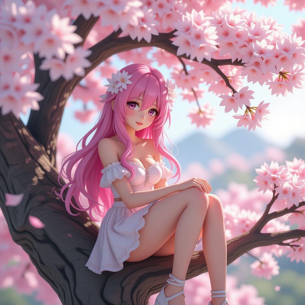 This 3D anime art features a girl with milk chocolate skin sitting on a tree. Her pink hair blends with branches, creating beautiful white flowers. Cinematic rendering with vivid colors.