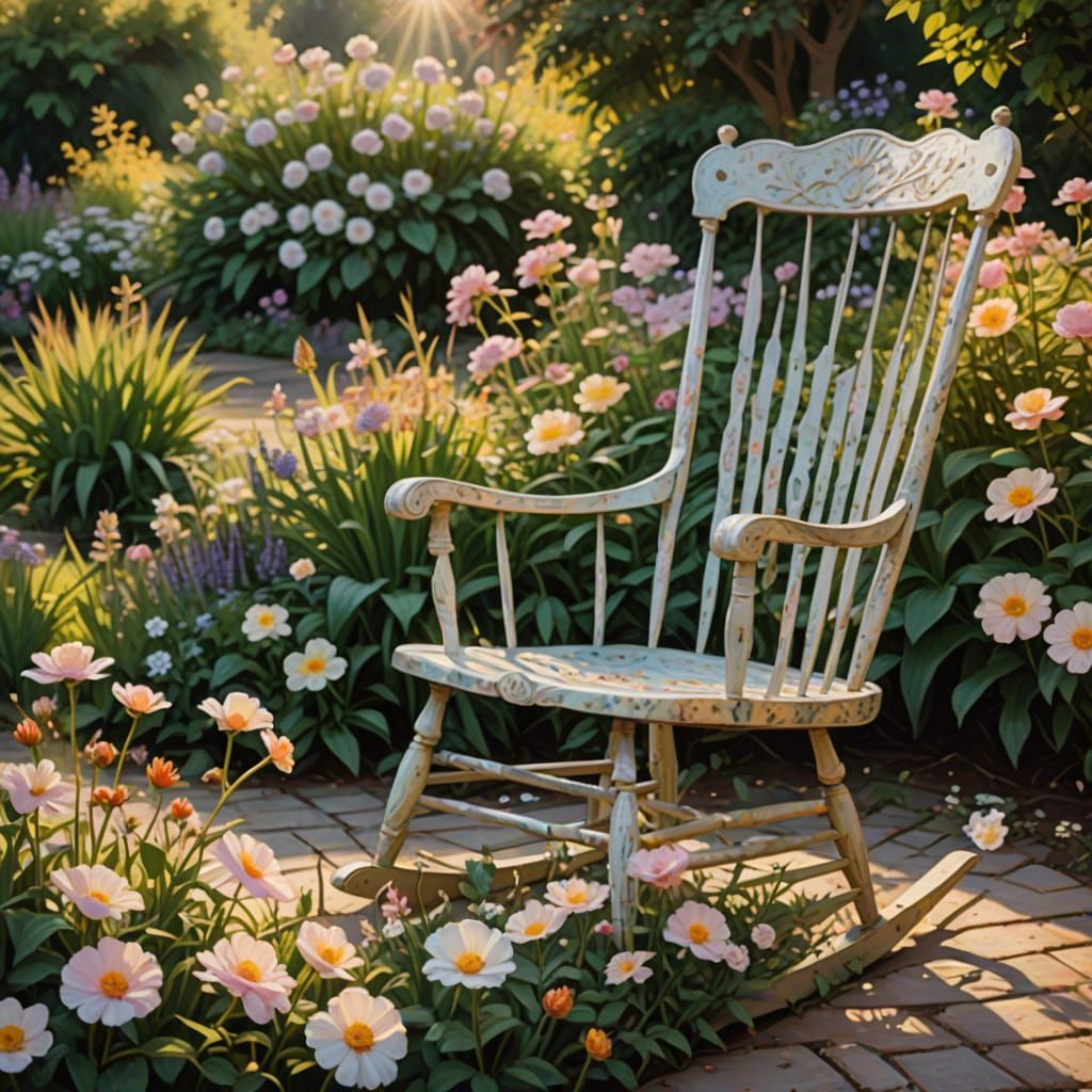 This image shows a rocking chair nestled in a vibrant garden. The scene is rendered in an impressionistic style, with soft, blurred details and a dreamlike aesthetic. The pastel palette enhances the ethereal quality.