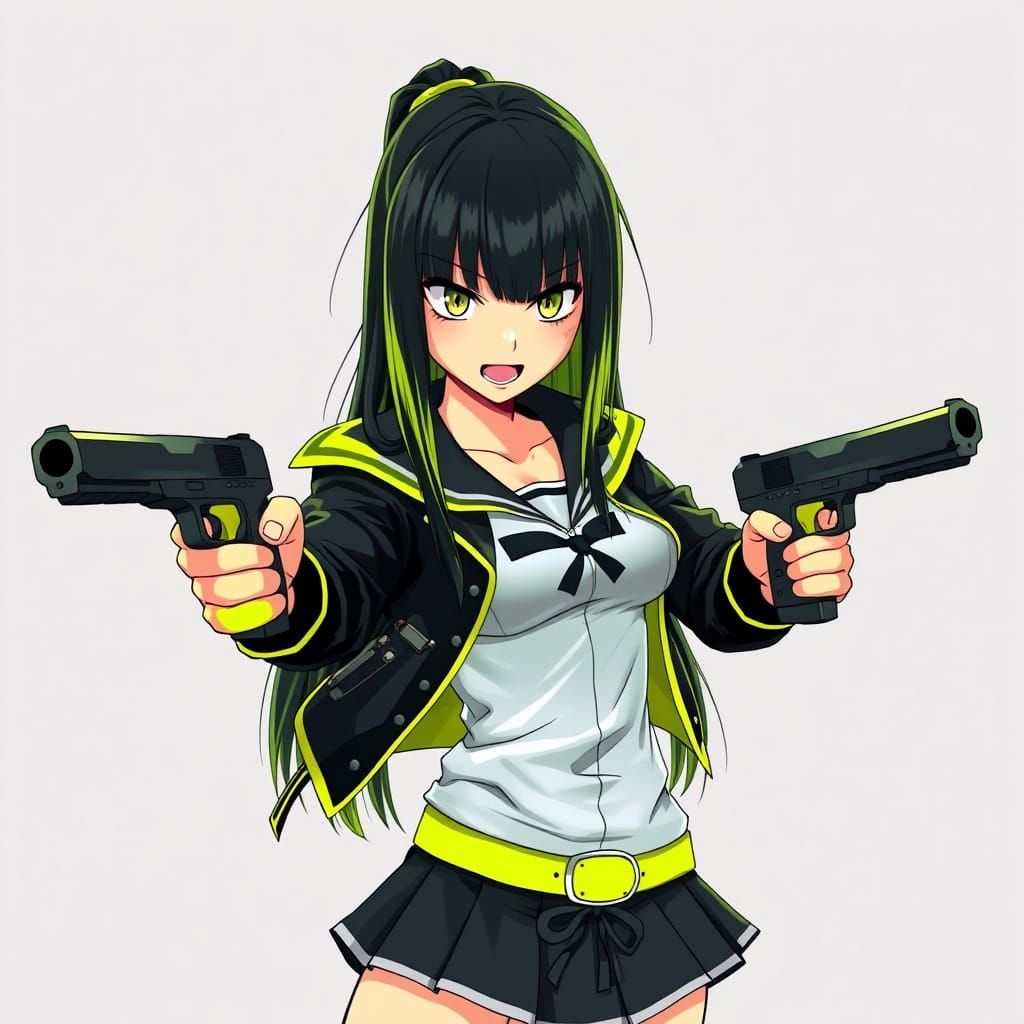 This image shows a dynamic anime girl villain with straight long hair and a bold, punk-inspired outfit, holding guns and radiating an air of intense energy, created in a vibrant, bold style reminiscent of Takashi Murakami and Hajime Sorayama's works.
