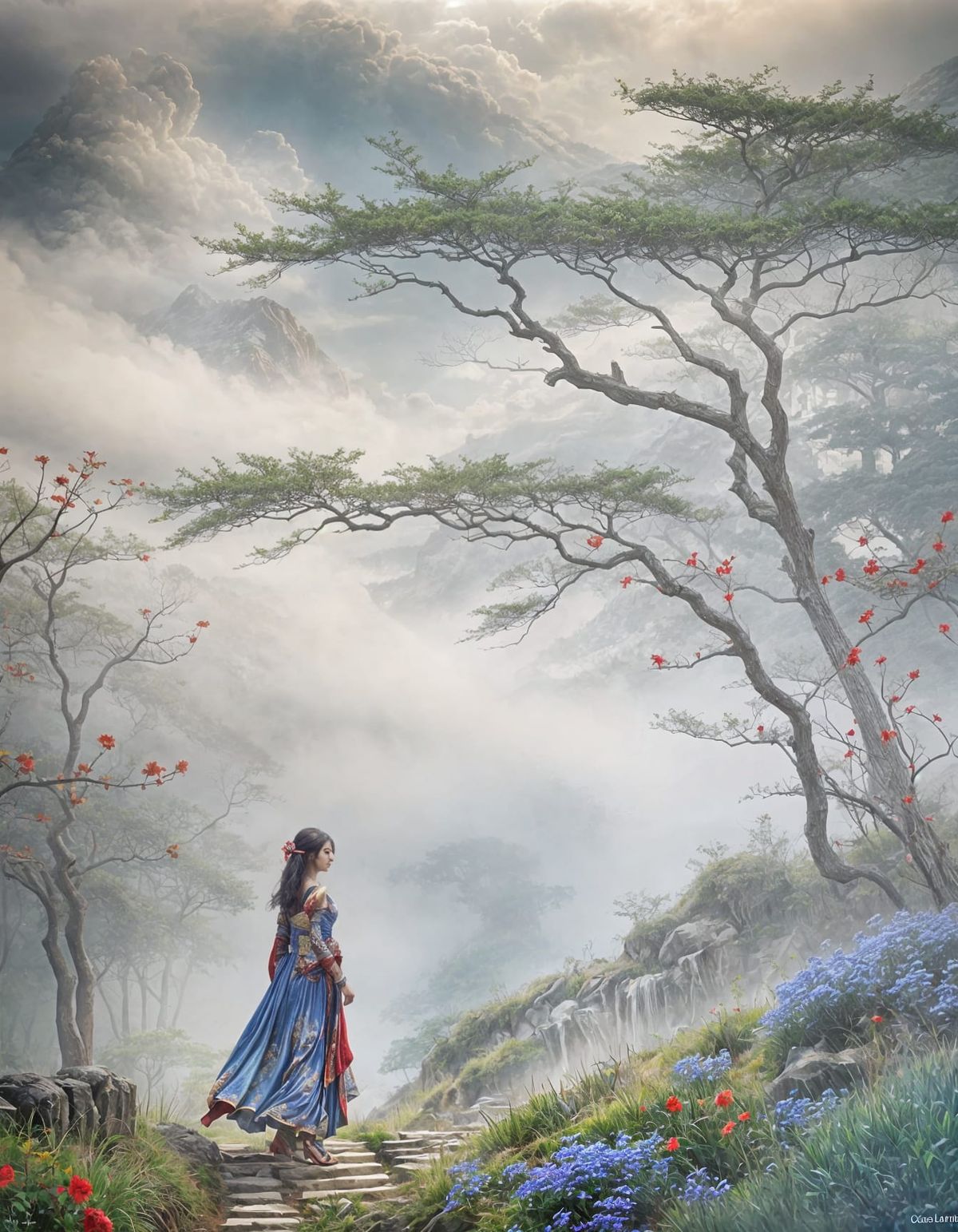 This image shows a goddess-like woman walking through an endless landscape. The fantasy art evokes an oil painting style with a focus on the beauty and gentleness of the female form.