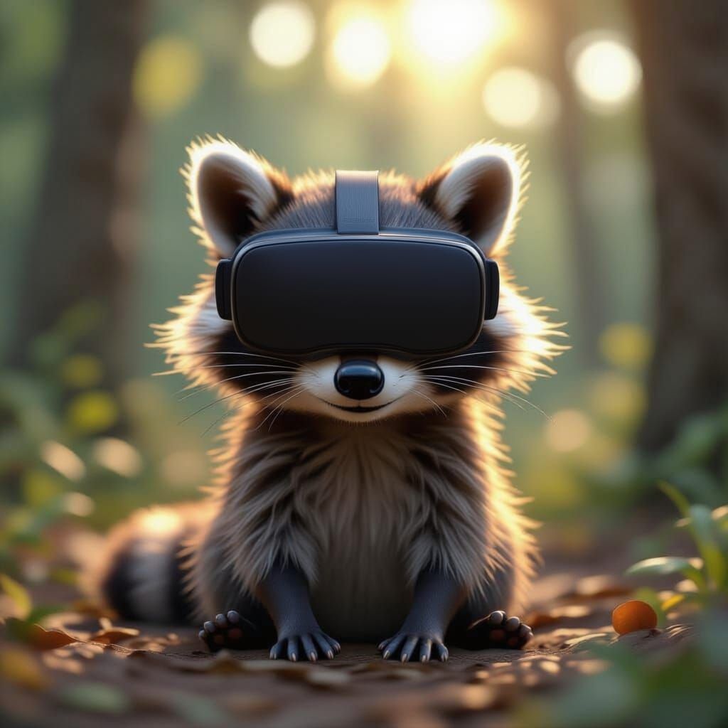 A detailed 3D anime-style image shows a raccoon wearing an Apple Vision Pro headset in a sunlit forest, with soft bokeh lighting creating an aesthetic, high-resolution scene.