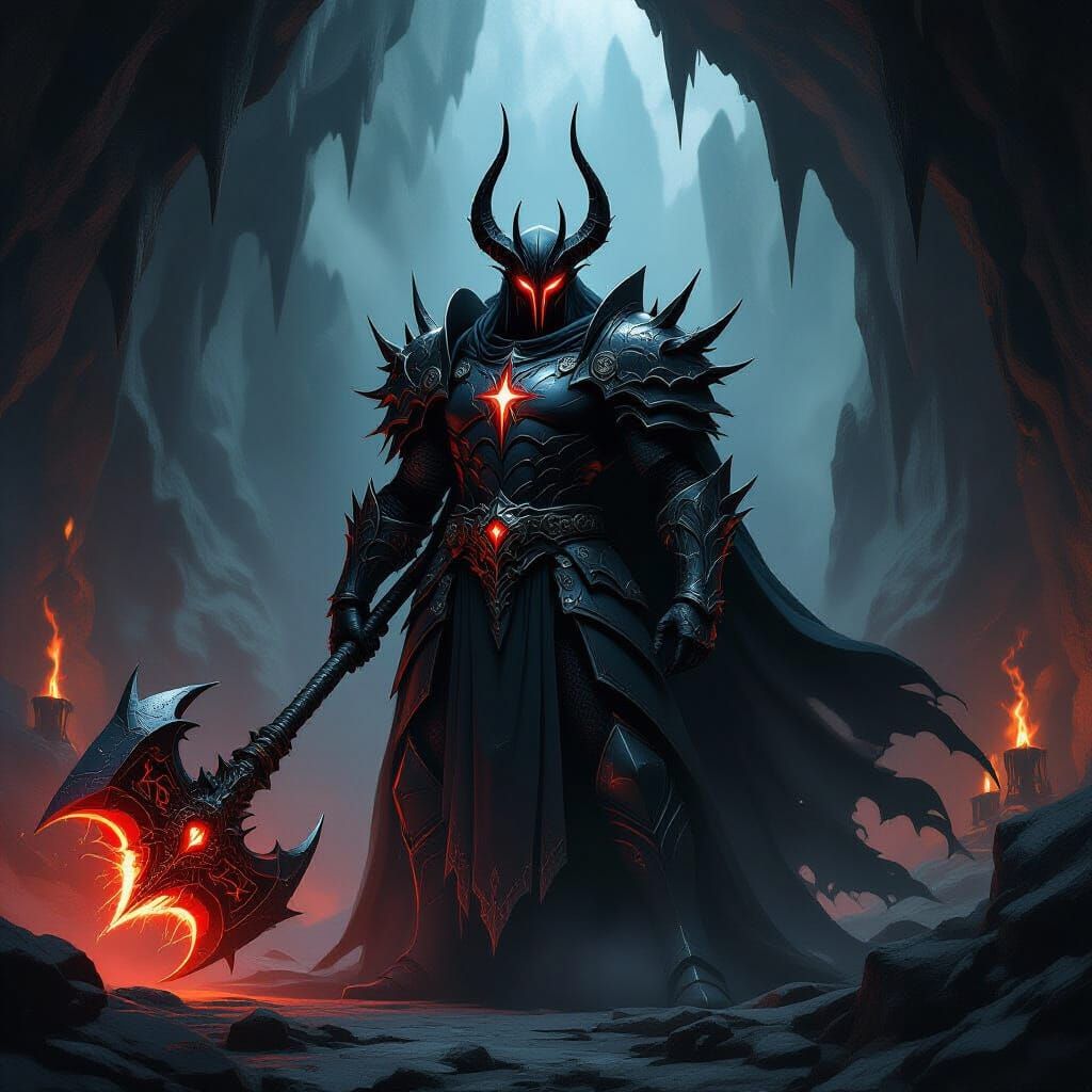 A striking picture of a Lord of Darkness in a shadowy cavern. The dark fantasy scene features dynamic lighting and hyperdetailed textures with rich purple and yellow complementary colors.