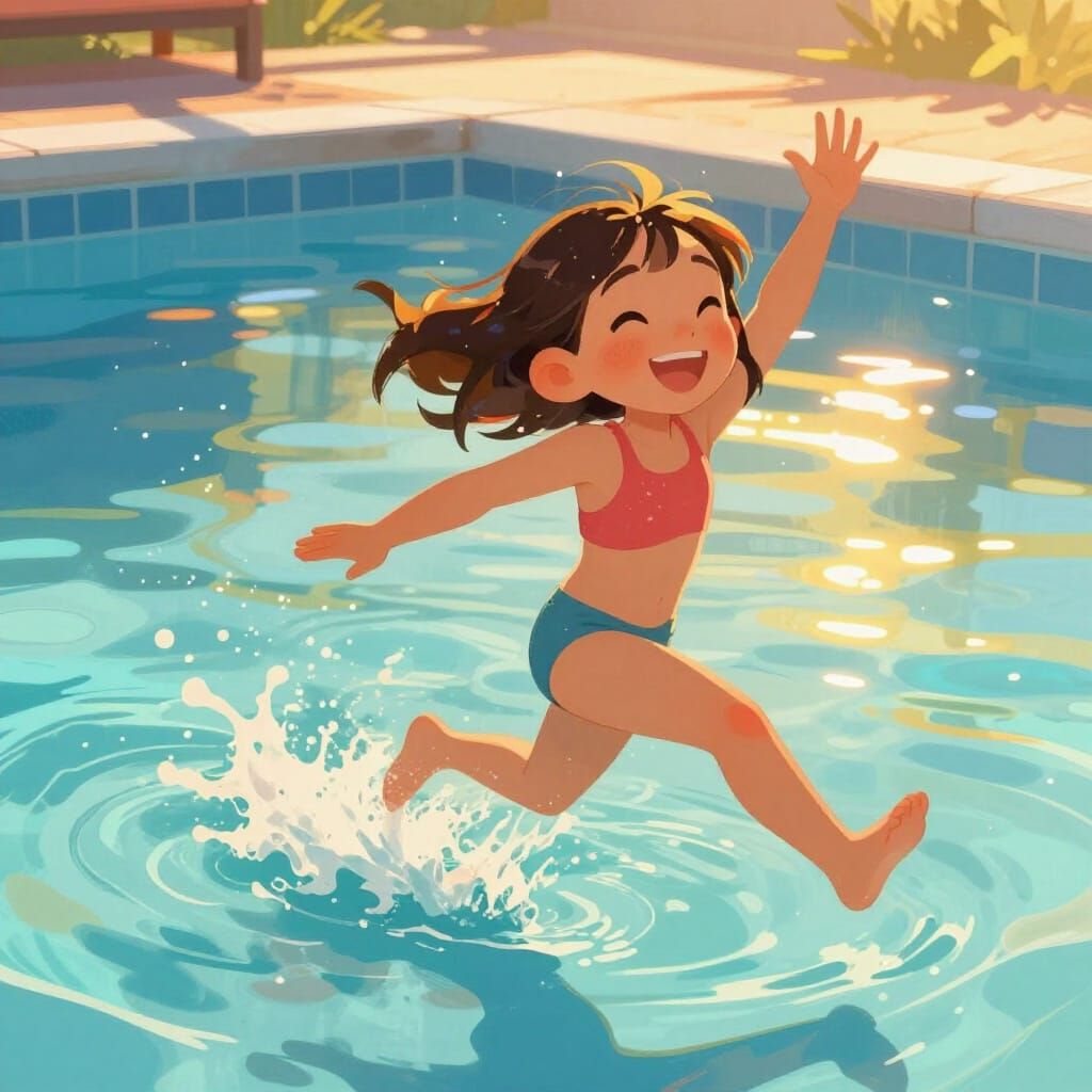 This image shows a young girl joyfully jumping into a swimming pool, creating a splash. Bathed in warm sunlight, the scene features vibrant colors and dynamic movement, rendered as digital art.