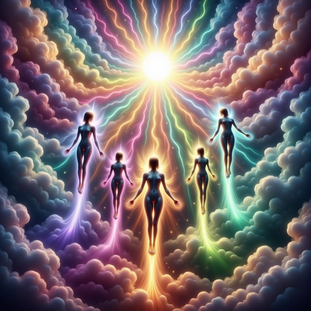 This image shows luminous, colorful humanoid figures with flowing energy trails ascending through galaxies and nebulae towards a radiant sun. It is rendered as a highly detailed, vibrant spiritual fantasy illustration.