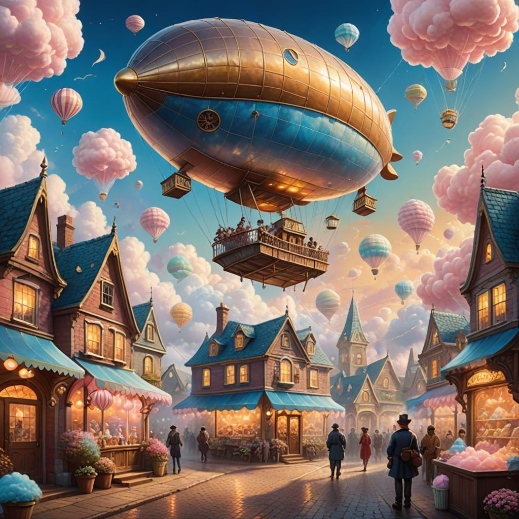 This image shows a quaint cotton candy shop with a vintage airship floating above it. The fantasy illustration, reminiscent of Kinkade, features sparkling sugar crystals and a dreamy, nostalgic atmosphere.