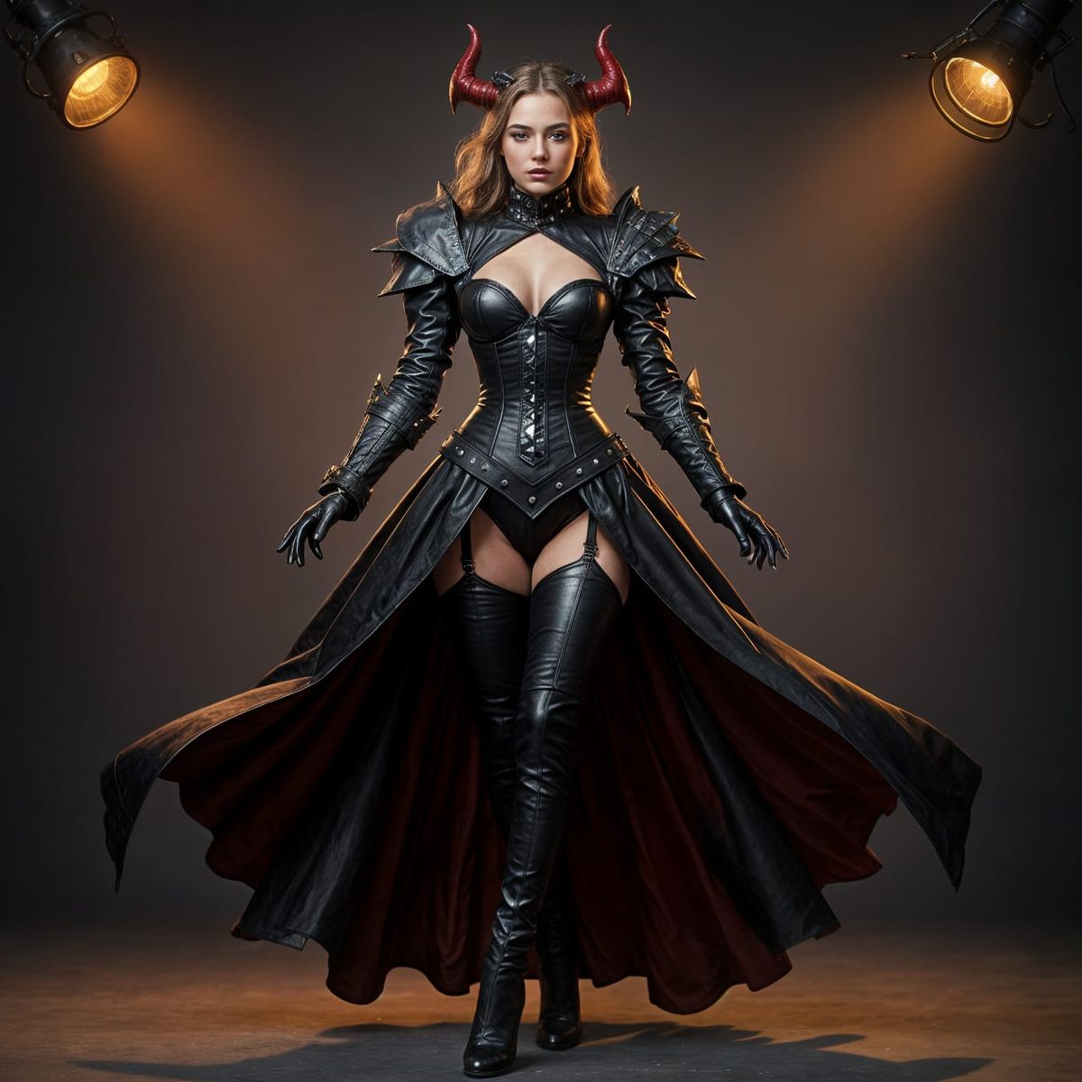 A striking studio portrait of a devil figure adorned in a detailed Victorian leather dress. The image captures a dramatic and stylish aesthetic.