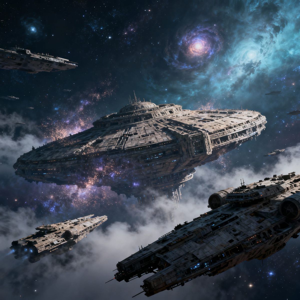 This image shows a colossal, ancient alien space station amidst nebulae and derelict ships, illuminated by quasar light. Rendered in a digital matte painting style with cinematic lighting and volumetric fog, it emphasizes epic scale and cosmic grandeur.