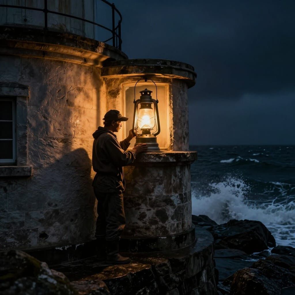 A solitary lighthouse keeper polishes a brass lantern, its warm light creating dramatic shadows within a stone tower. Hyperrealistic, with intense chiaroscuro lighting and cinematic detail.